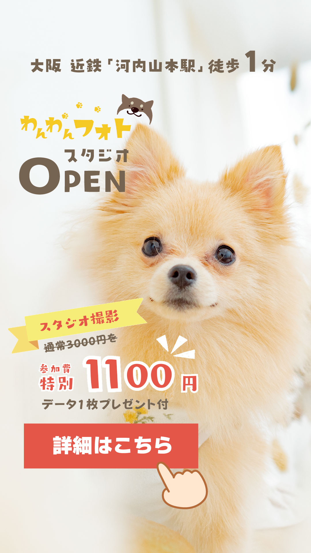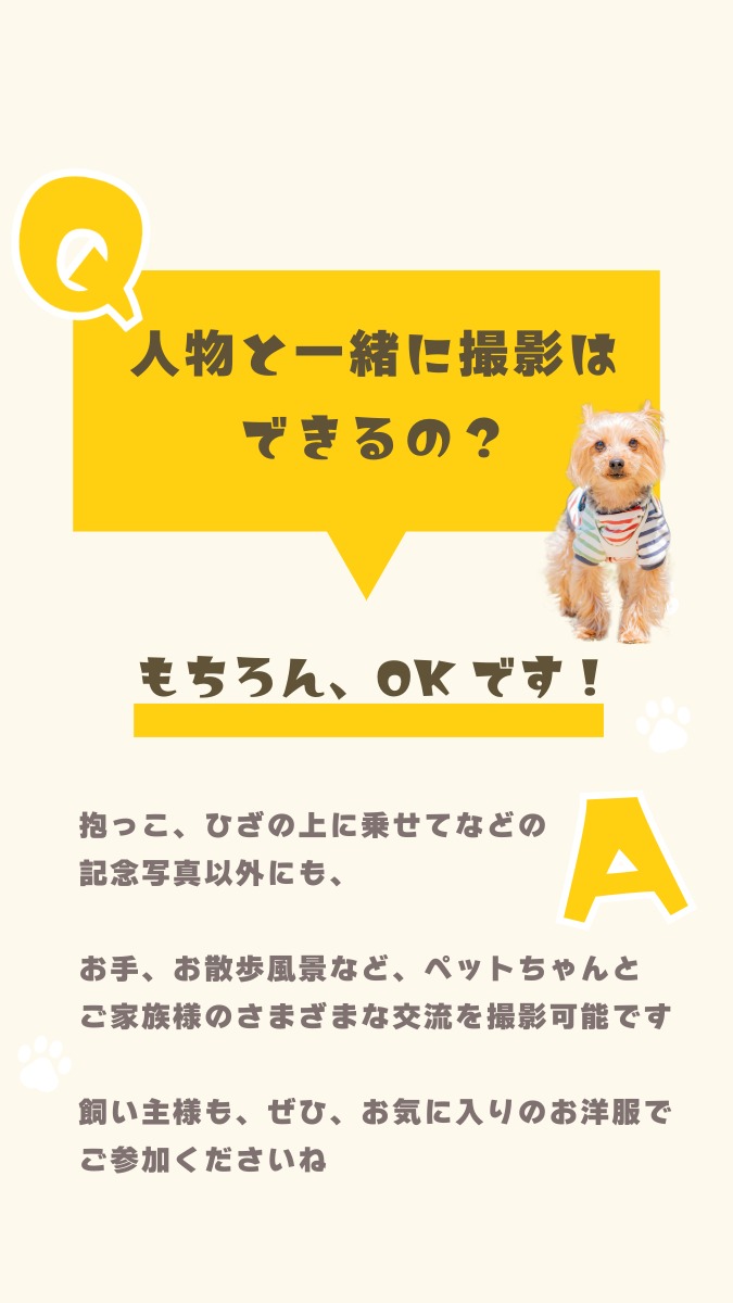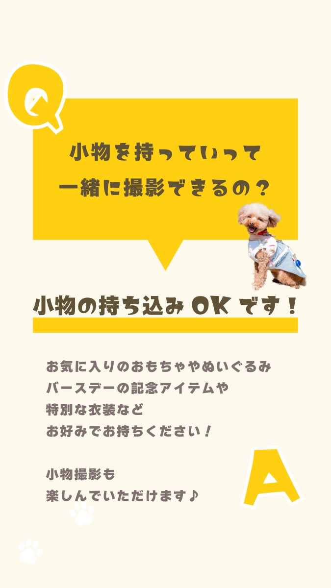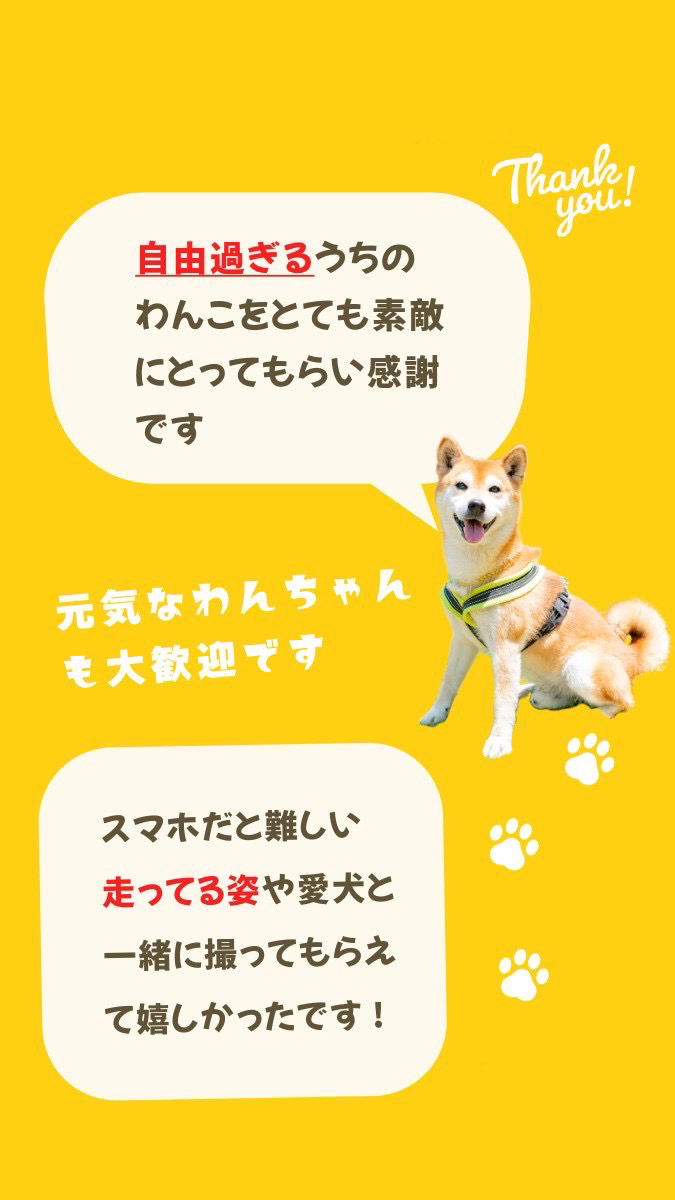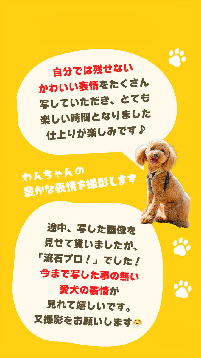 時間内で、ペット様のソロショット、ご家族様と一緒のショット、走ったり動きのあるショット、お手などの芸、抱っこ、表情のアップ、背景を変えてなど、ペット様とご家族様の魅力をギュッと凝縮したお写真を撮影をいたします♩